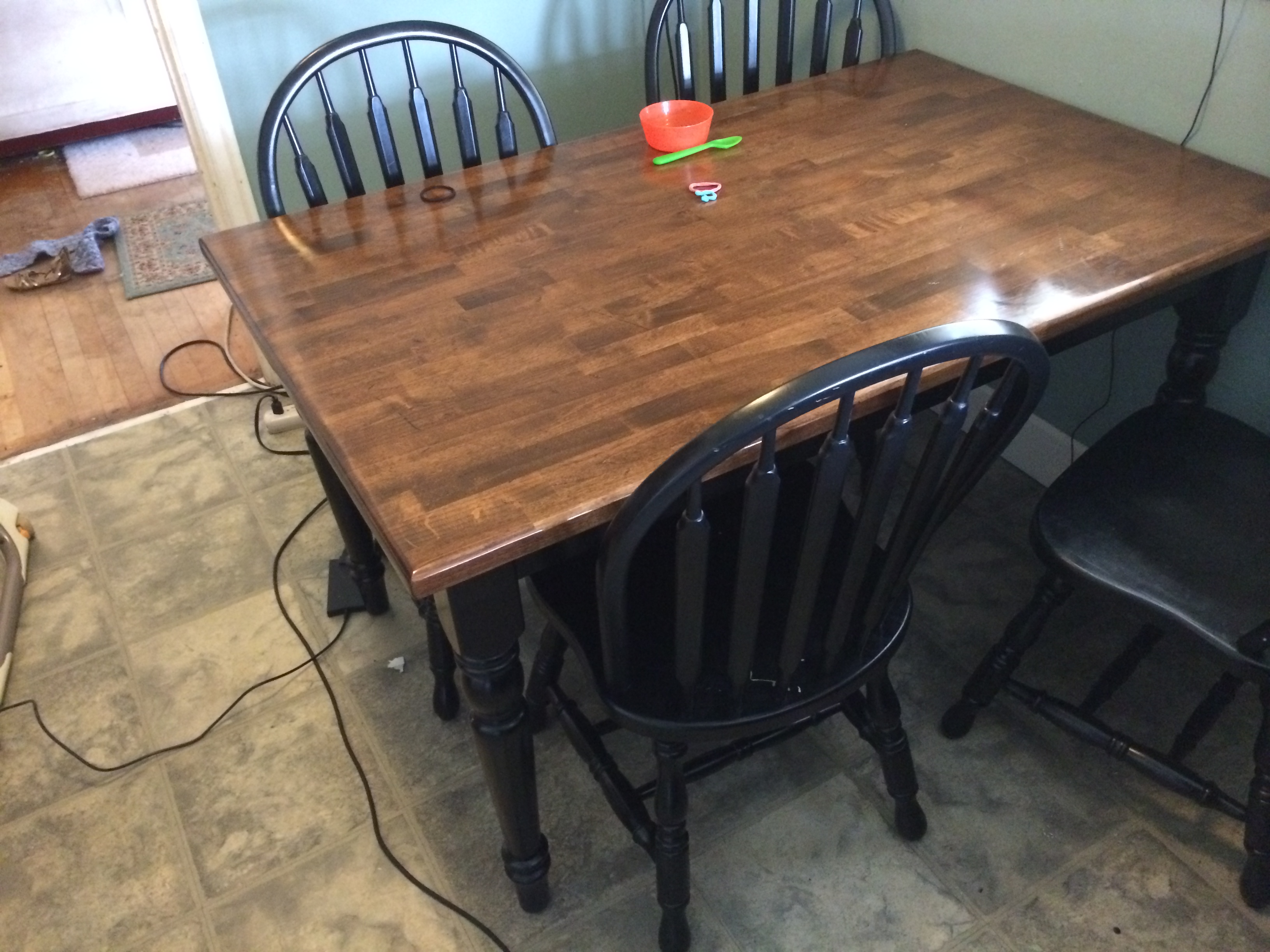 We had a decent amount of condensation that morning so when he went to check it out in the morning the polyurethane had not adhered to the table! It ended up flaking off! Luckily the other three coats had been properly applied so they were fine we just had to clean the flaking layer off, do the light sand and then apply the last coat (which we did in the garage so we didn’t have to worry about the condensation or rain). We let it sit for 3 days to cure and then reassembled the table, it looks great! Since this project took a good part of a week to complete I took advantage of my empty kitchen and found some paint in the garage that Mike bought in the discount section at Sherwin Williams for a dollar and painted the kitchen! Which then lead me to finding some black paint and painting the lower cabinets in our kitchen black, I kept on looking at black and white kitchens on Pinterest and of course when I get on a roll there’s no stopping me! I’m still not completely done, I need to paint the handles and would like to get some white paint to repaint the upper cabinets to freshen them up. I painted our kitchen an apple green when we first moved in almost 10 years ago (omg! can’t believe we’ve been in this rental that long) so definitely was time to update a bit.